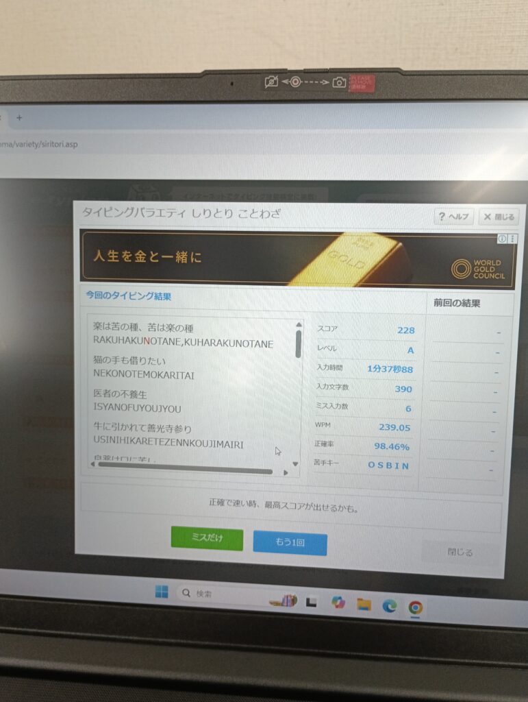 コツコツと練習を積み重ね継続し。その結果、先日行われたタイピング技能検定「e-typing」では、