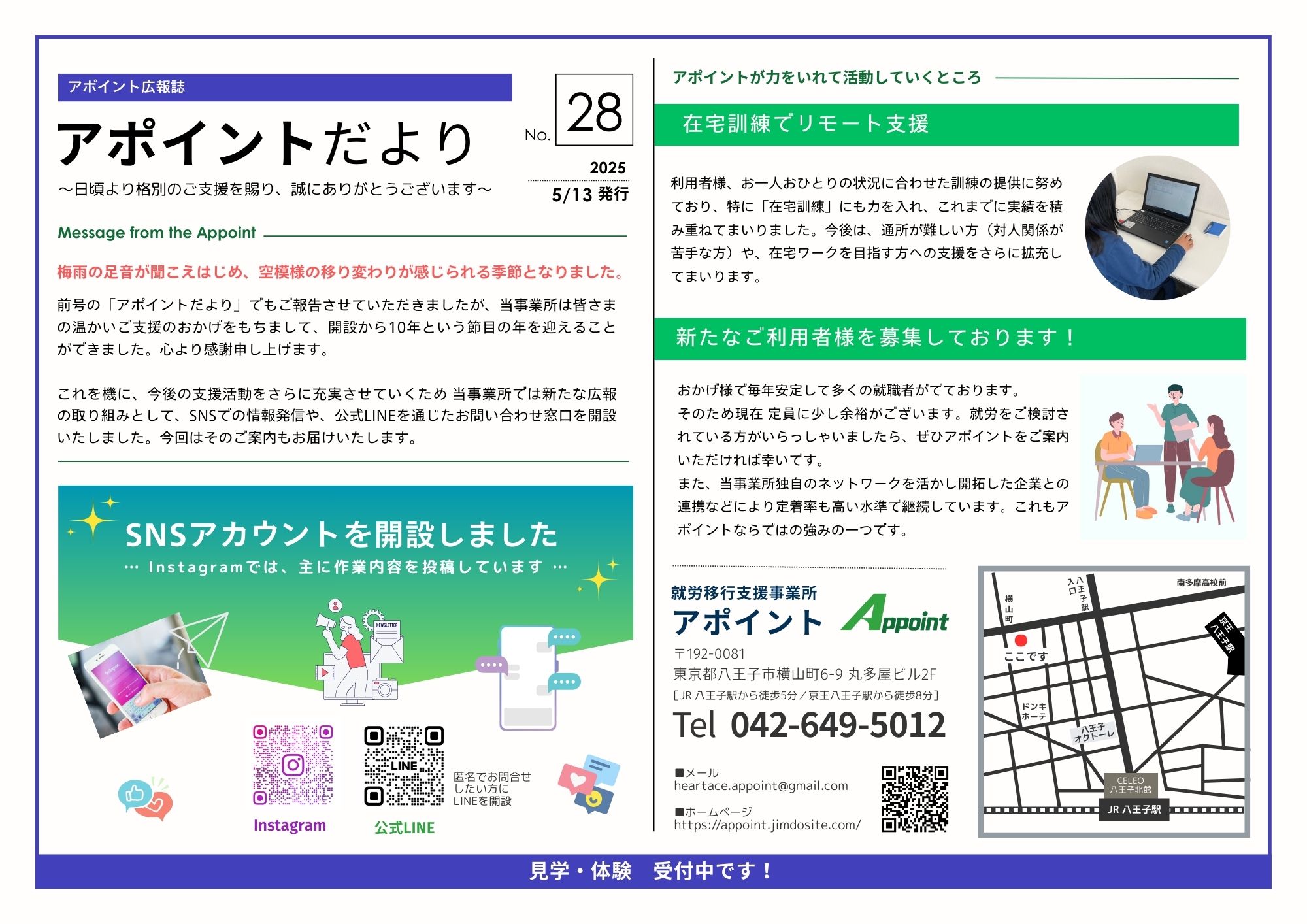 就労移行支援事業所アポイントでは、今後の支援活動をさらに充実させていくため 新たな広報の取り組みとして、SNSでの情報発信や、公式LINEを通じたお問い合わせ窓口を開設いたしました。 問合せをしたい気持ちがあっても「電話 …続きを読む
